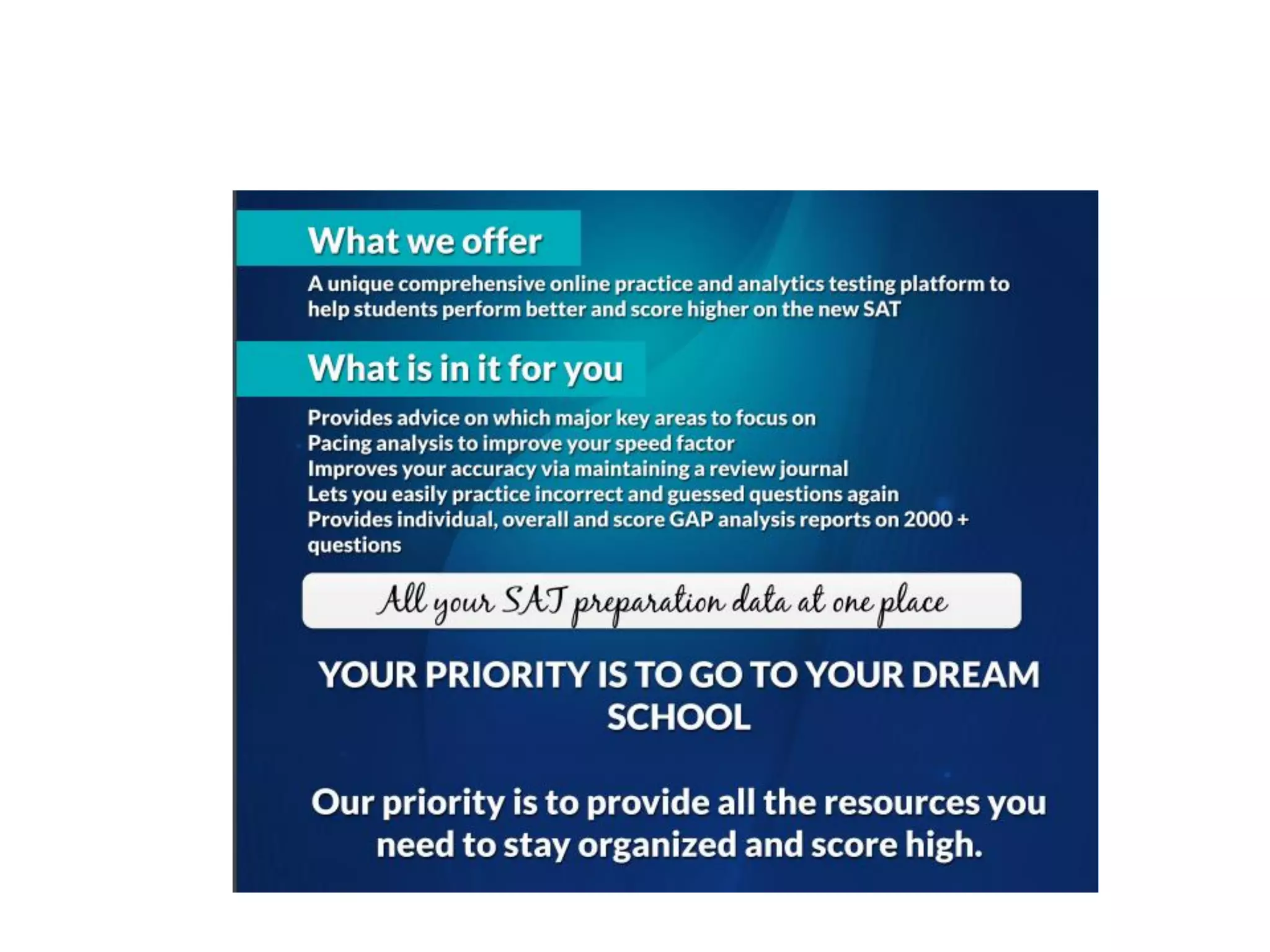The document provides an overview of the SAT and PSAT tests, including their structure, scoring, and preparation strategies, highlighting the benefits of using the MySATAdvisor platform for tailored study assistance. It emphasizes the importance of addressing concerns like speed and accuracy in test preparation. Additionally, the document lists scholarship opportunities for National Merit Finalists from various universities.