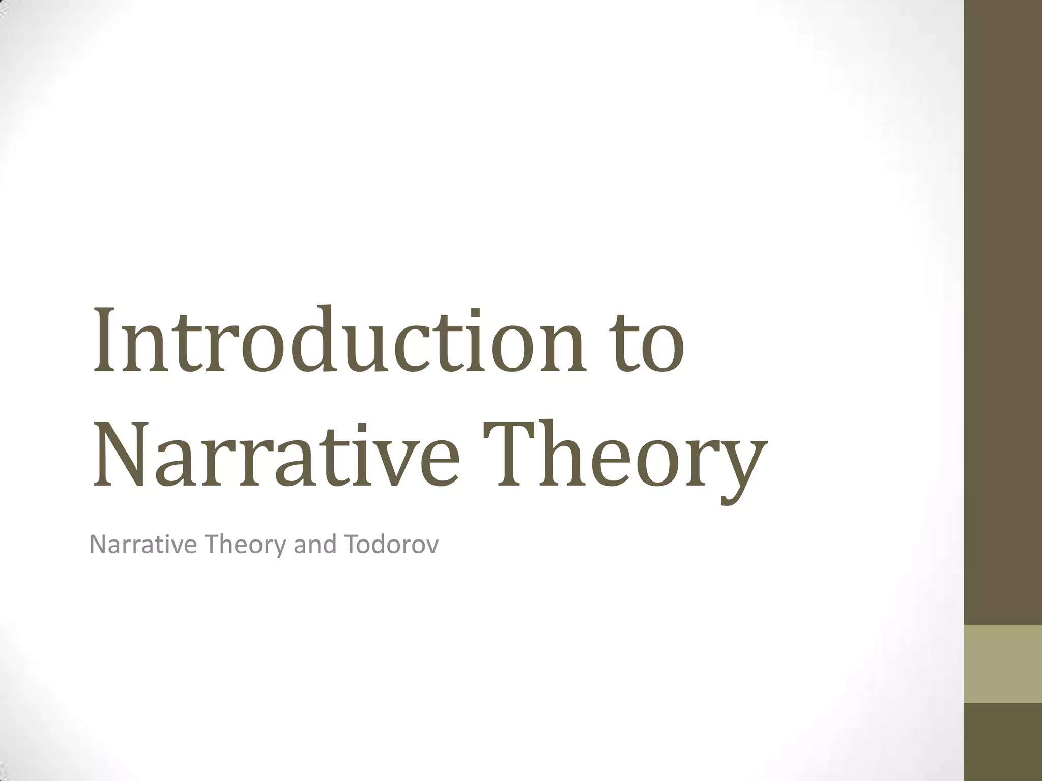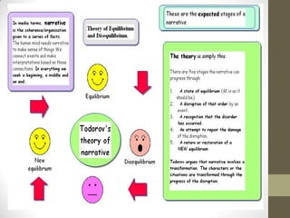This document provides an introduction to narrative theory, focusing on concepts from Tzvetan Todorov. It defines key terms like narrative, plot, and story. Narrative is how a story is told, plot is the order events are discovered, and story is the chronological order. It discusses three narrative structures: circular starts at the end, episodic uses flashbacks, and linear is simple cause-and-effect. Narrative viewpoint can be restricted to a character's knowledge or omniscient allowing more information. Genres like crime tend toward restricted viewpoint while others like sci-fi may be omniscient. Todorov's theory outlines narrative in 5 stages from equilibrium to disruption to resolution. The document suggests applying