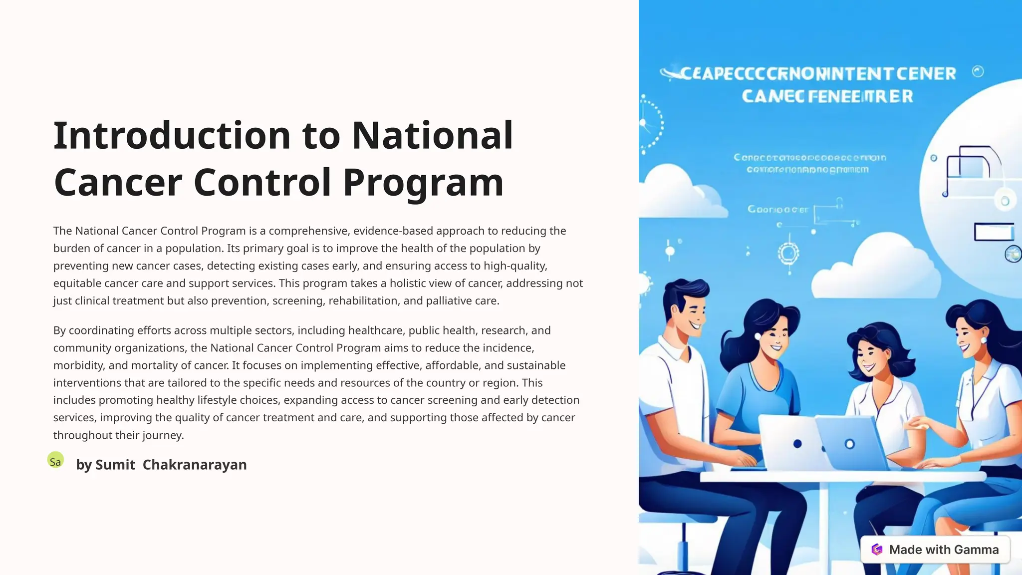 The National Cancer Control Program aims to reduce cancer incidence, morbidity, and mortality through a comprehensive, evidence-based approach that includes prevention, early detection, treatment, and palliative care. It emphasizes equitable access to services, coordination among various stakeholders, and the importance of addressing social and environmental factors affecting cancer risk. The program also focuses on continuous data monitoring and innovative research to improve cancer management and support survivors in their journeys.