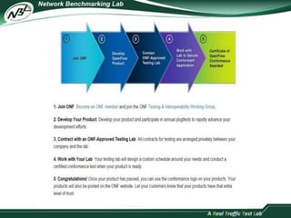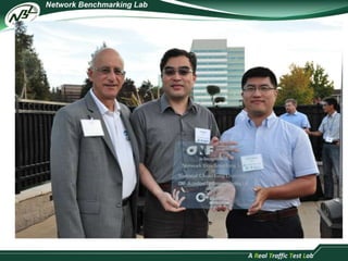 This document discusses the development of test tools and RealFlow testing at a third-party testing lab. It describes various self-designed test tools developed to automate testing of devices like routers, switches, and wireless products. It also outlines how RealFlow testing uses real network traffic replay techniques to test products under realistic conditions captured from a beta testing site. Finally, it mentions some experiments conducted with Software Defined Networking and OpenFlow technologies.