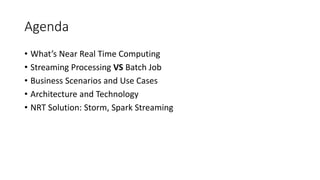 Near real-time computing processes data as it streams in within seconds, enabling immediate analytics and decisions. It is used for scenarios like fraud detection and web monitoring that require non-stop availability and processing. Near real-time systems like Storm and Spark Streaming work by processing data in micro-batches within 1-2 seconds using in-memory computation for low latency. They provide scalability, fault tolerance and support stateful operations on streaming data.