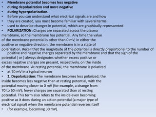 Nerve and muscle cells are excitable tissues that can produce electrical signals. These electrical signals are critical for the function of the nervous system and muscles. Electrical signals are produced by changes in ion movement across the plasma membrane. The membrane potential can change through depolarization, becoming less negative, or hyperpolarization, becoming more negative. These changes are driven by the opening and closing of ion channels in response to triggering events, allowing ions to move across the membrane and change the voltage. There are two basic types of electrical signals in nerve and muscle cells: graded potentials for short-distance signaling and action potentials for long-distance signaling.