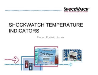 This document provides an overview and update of ShockWatch's temperature monitoring product portfolio. It introduces their new single-use WarmMark2 and ColdMark2 indicators, which have improved accuracy and ease-of-use compared to previous generations. It also highlights their multi-use TempMark8 electronic temperature indicator, which simultaneously monitors 8 temperature thresholds and provides detailed excursion data. The portfolio offers solutions for indicating, recording, and preventing temperature issues across the cold chain through accurate, cost-effective products tested for reliability.