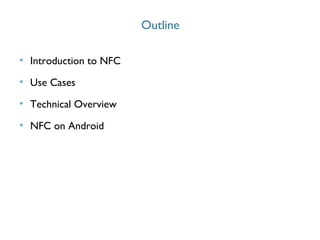 This document provides an introduction and overview of Near Field Communication (NFC) technology. It discusses NFC use cases and the technical details of NFC, including the different tag types, specifications, and communication modes. It then focuses on how NFC is implemented on Android devices, explaining how the tag dispatch system works to retrieve data from NFC tags and route intents to the appropriate applications based on the data and intent filters. Examples are provided of creating NDEF messages and corresponding intent filters for different data types.