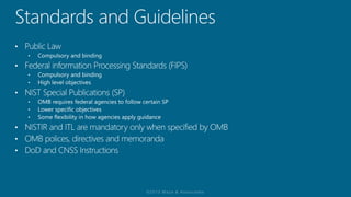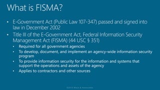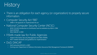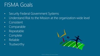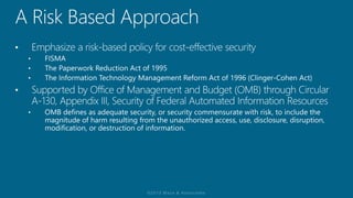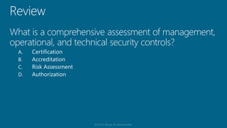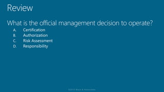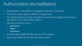 The document discusses the methodology of certification and accreditation aimed at ensuring security controls for information systems, highlighting their importance in protecting information system integrity, confidentiality, and availability. It defines the management decision to authorize system operation while accepting associated risks and proposes the need for robust security measures. The content reflects on the vulnerabilities agencies face against cyber threats, emphasizing the significance of implementing agreed-upon security controls.