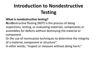 The document provides an introduction to nondestructive testing (NDT). It defines NDT as inspecting or testing materials without destroying them to find defects. NDT is used across many industries to inspect equipment and ensure safety. Common NDT methods described include visual testing, liquid penetrant testing, magnetic particle testing, ultrasonic testing, electromagnetic testing, radiographic testing, and acoustic emission testing. NDT can be used at all stages of production and equipment lifecycles to detect flaws and ensure quality and integrity.