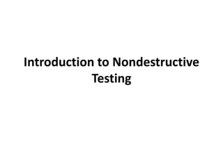 Nondestructive testing (NDT) allows inspection of materials and components without damaging them. It is used across many industries to ensure safety and integrity. Common NDT methods include visual testing, liquid penetrant testing, magnetic particle testing, ultrasonic testing, electromagnetic testing, radiographic testing, and acoustic emission testing. NDT is used at all stages from manufacturing to operation to detect flaws, measure properties, and inspect for damage.