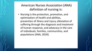 The document outlines the concept, definition, and scope of nursing, emphasizing its role in providing care to individuals, families, and communities across various settings. It highlights key nursing functions such as health promotion, illness prevention, and patient advocacy, as well as the importance of fostering interactions between nurses and clients. Additionally, it details the various roles and responsibilities of nursing professionals in the care continuum.