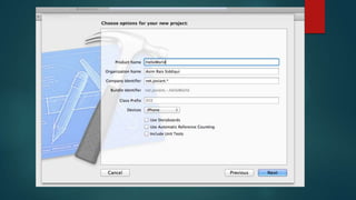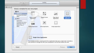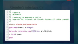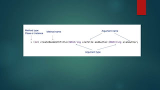 Objective-C is an object-oriented programming language that is a superset of C. It was developed in the 1980s on top of C to provide object-oriented capabilities. Objective-C uses classes and messages to define methods and invoke behaviors on objects. Developers create classes with properties and methods to define behaviors and attributes for objects. Memory is managed through retain counts, and objects communicate by sending messages to each other to invoke methods.