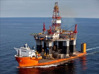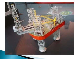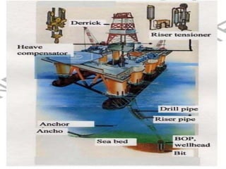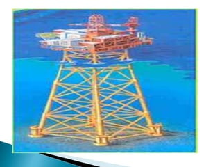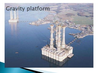 There are several types of oil platforms used to extract oil and natural gas from offshore sites. Fixed platforms are anchored directly to the seabed using concrete or steel legs. Jackup platforms have legs that can be lowered to the seabed for drilling but are raised during operations. Semi-submersibles have good stability in rough seas and are commonly used for offshore drilling in deep waters. Compliant and floating platforms are connected to the seabed and can move with external forces.