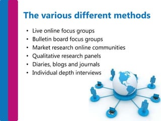 The document outlines various online qualitative research methods such as live online focus groups, bulletin board focus groups, and individual depth interviews, detailing their processes and applications. It emphasizes the importance of choosing the right method based on the type of feedback desired and provides insights into participant engagement and incentives. Additional details include guidance on getting started with online qualitative research tools and effective participant recruitment.