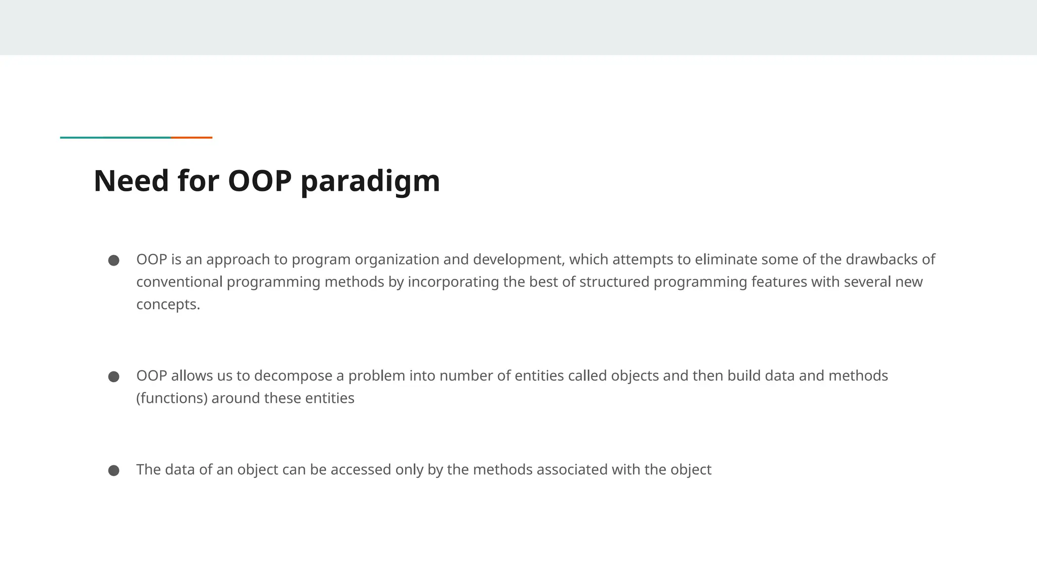 The document introduces Object-Oriented Programming (OOP) as a paradigm that combines structured programming features with new concepts, allowing programmers to build applications using objects. It explains key OOP concepts like classes, inheritance, polymorphism, data abstraction, and encapsulation, outlining their purposes and differences from procedural programming. Additionally, it discusses method overloading and overriding, binding, and exception handling, providing examples to demonstrate how these concepts are implemented in languages like Java.