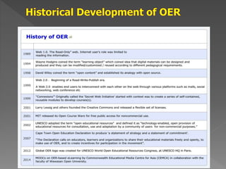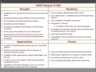 This document discusses open educational resources (OER). It defines OER as digitized materials that are freely available online for educators, students, and self-learners to use and reuse for teaching, learning, and research. OER includes learning content, software tools to develop content, and implementation resources. Examples mentioned include open learning, open access, open scholarships, open badges, Creative Commons licenses, and MOOCs. Benefits of OER include reducing barriers to education by providing open access to educational resources. Challenges include lack of infrastructure and awareness in some countries.