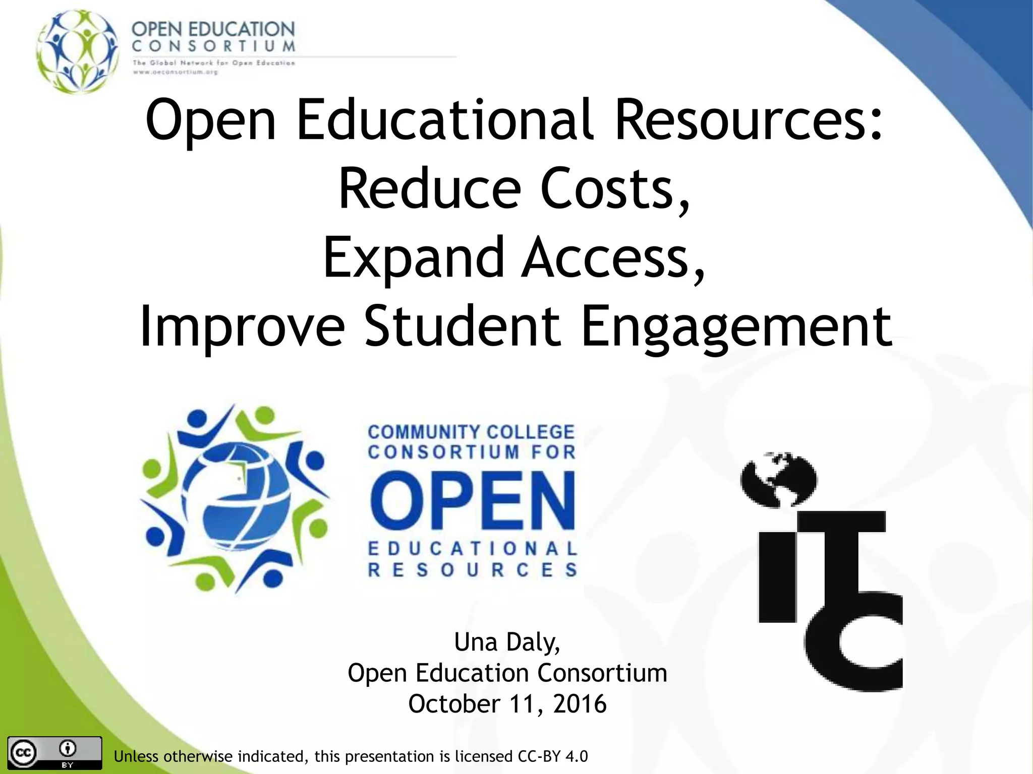 This document summarizes an October 11, 2016 presentation by Una Daly of the Open Education Consortium about open educational resources (OER). The presentation defined OERs, discussed how adopting OERs can reduce costs and improve access and engagement for students, and outlined the steps faculty can take to discover, adopt, and sustain the use of OERs in their courses. Key points included that OERs are teaching materials that are free to use and adapt, textbook prices have risen over 80% in 12 years, and studies have found OER adoptions impact over 100,000 students with equal or better outcomes at a savings of millions of dollars.