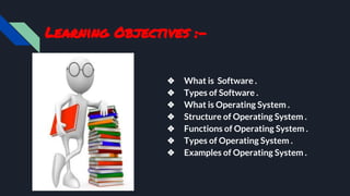 The document provides an overview of operating systems, software types, and their functions. It explains the role of operating systems as managers that control system tasks, manage resources, and act as an interface between users and hardware. Additionally, it details various types of operating systems, including batch, time-sharing, distributed, network, and real-time systems, along with their advantages and disadvantages.