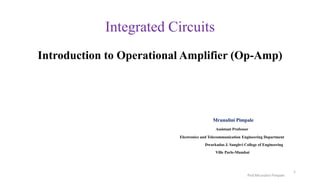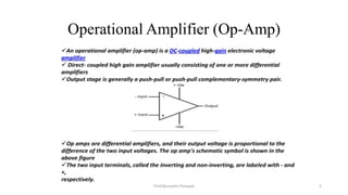 This document provides a comprehensive overview of operational amplifiers (op-amps), including their definition, functionality, and characteristics. It discusses the differential amplifier configuration, gain stages, and practical parameters of the IC 741 op-amp, highlighting its features like high input impedance and low output resistance. Various configurations and applications of op-amps are also examined, underscoring their role in amplifying voltage signals in electronic circuits.