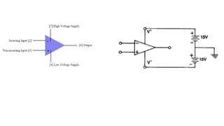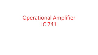 The document discusses the operational amplifier (op-amp) IC 741, explaining its function in performing mathematical operations and amplifying signals. It details the internal structure, ideal characteristics, limitations of open-loop configurations, and the necessity of negative feedback for linear applications. The summary includes practical applications such as inverting and non-inverting configurations and the concept of virtual ground.