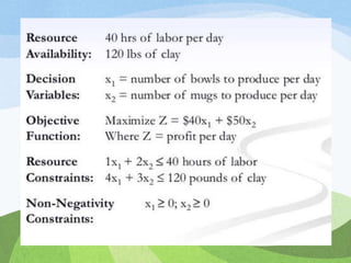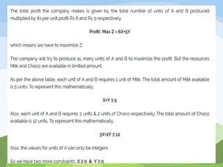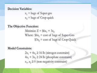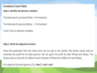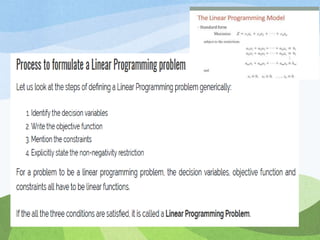 The document provides an introduction to operations research. It discusses that operations research is a systematic approach to decision-making and problem-solving that uses techniques like statistics, mathematics, and modeling to arrive at optimal solutions. It also briefly outlines some primary tools used in operations research like statistics, game theory, and probability theory. The document then gives a short history of operations research, noting that it originated in the UK during World War II to analyze problems like radar systems. It concludes with discussing the scope and applications of operations research in fields like management, regulation, and economics.