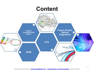 This document provides an introduction to optical backbone networks. It discusses key topics like WDM, OTN, optical communication basics, and the future of packet optical integration. The document contains sections on optical communication principles including waves, fiber optics, attenuation, dispersion, nonlinearity, and the ITU wavelength grid. It aims to explain how techniques like WDM, amplification, dispersion compensation, and new fiber types increase network capacity and distance.