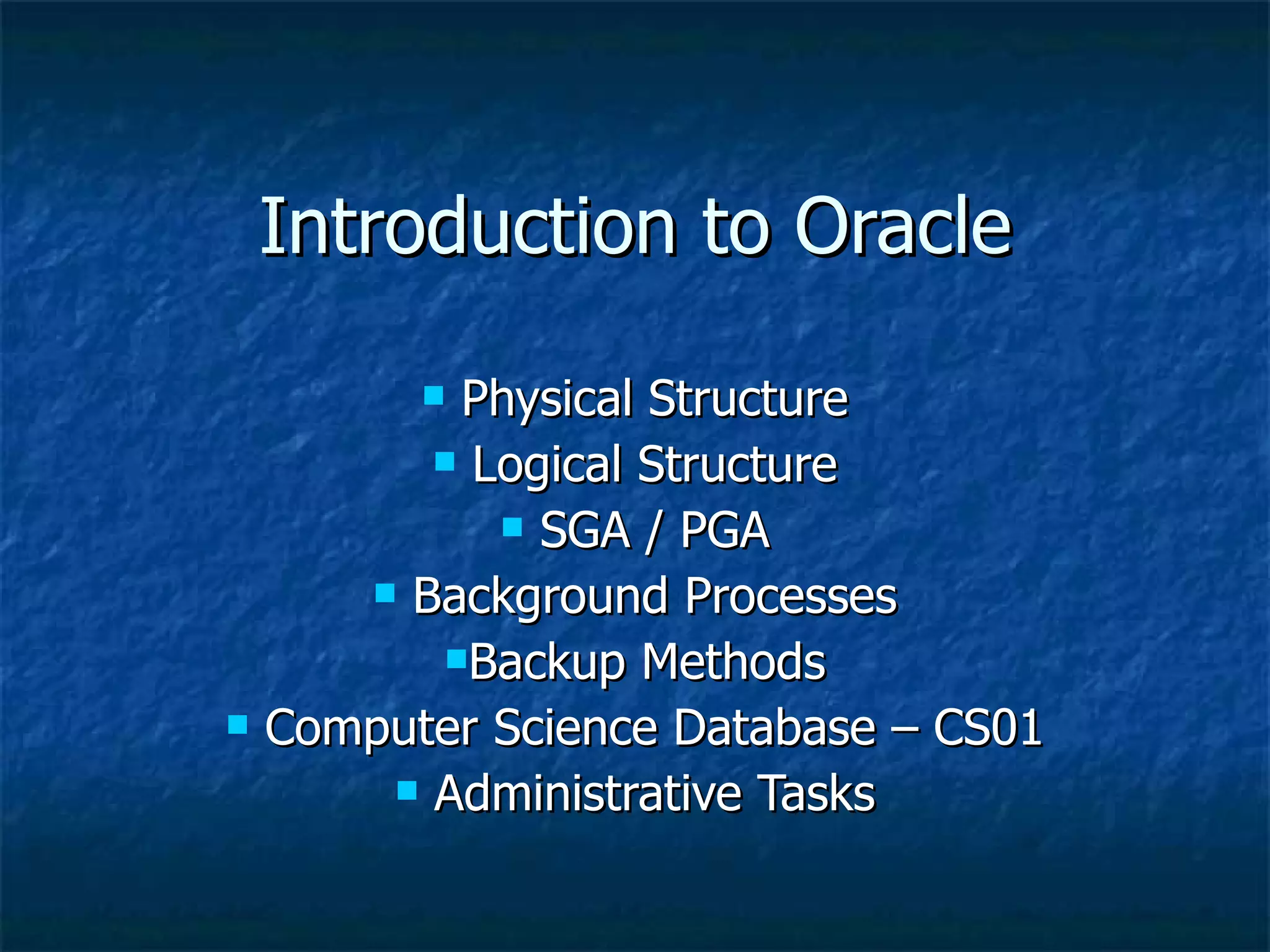 The document provides an overview of Oracle database physical and logical structures, background processes, backup methods, and administrative tasks. It describes key components like datafiles, control files, redo logs, tablespaces, schemas and segments that make up the physical and logical structure. It also explains the system global area (SGA) and program global area (PGA) memory structures and background processes like SMON, PMON, DBWR, LGWR and ARCH that manage the database instance. Common backup methods like cold backups, hot backups and logical exports are summarized. Finally, it lists some daily, weekly and other administrative tasks.