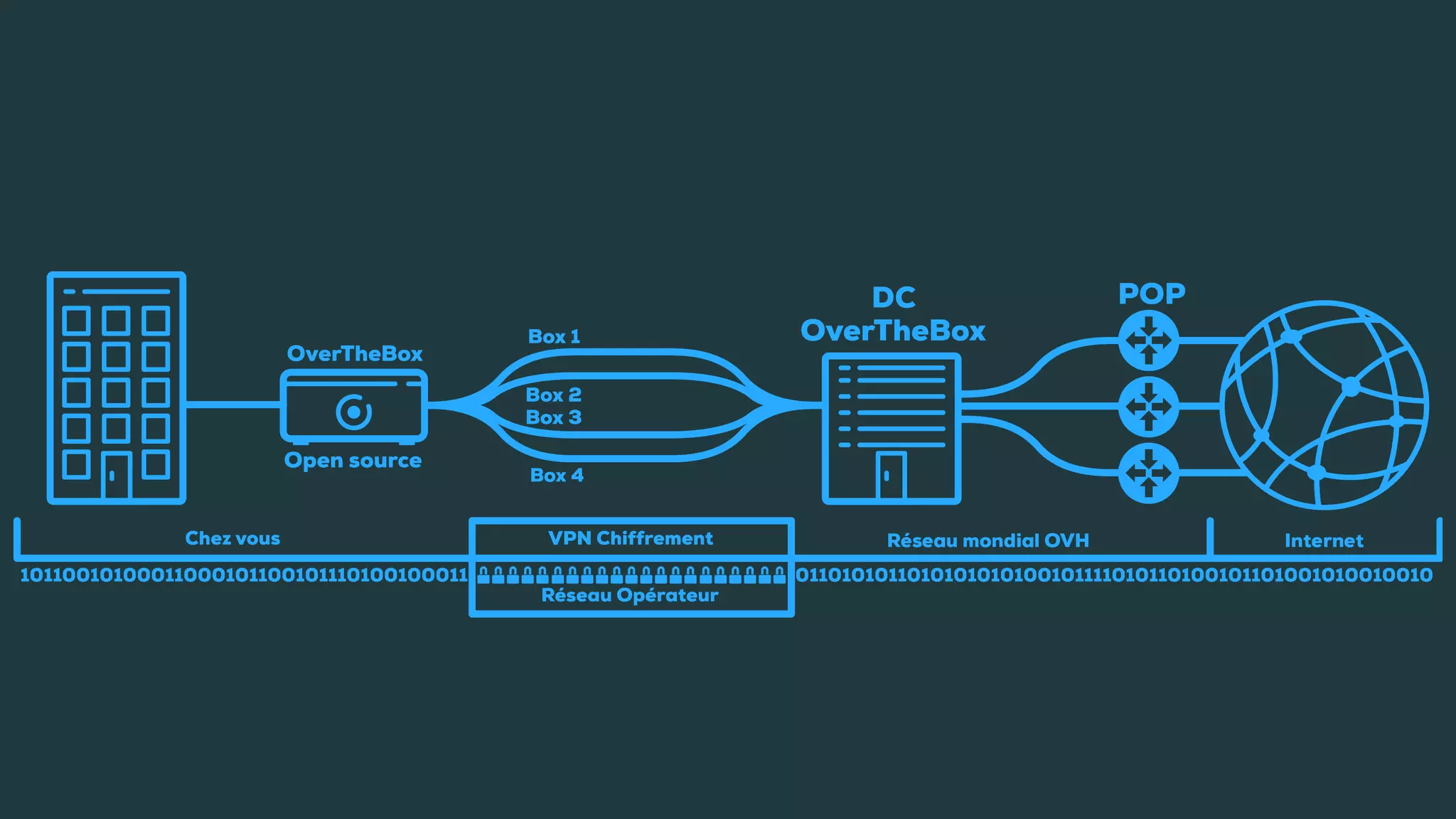 OVH's OverTheBox is a multi-WAN service that aggregates traffic from up to four internet connections on a single IPv4 address, ensuring load balancing and active fail-over to maintain connectivity. The system utilizes advanced technologies like MPTCP for TCP session management and is designed to work with various internet providers. Users can easily connect and configure the OverTheBox service through a web interface for enhanced internet performance and redundancy.