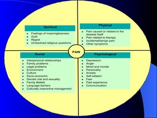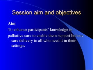 The document provides an introduction to palliative care and a holistic approach. It defines palliative care according to the WHO as improving quality of life for patients facing life-threatening illness through preventing and relieving suffering. Key principles of palliative care discussed include taking a holistic, patient-centered approach and using a multidisciplinary team. Factors affecting provision of palliative care and strategies for improving services are also outlined.
