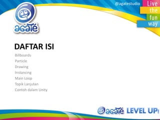 Dokumen ini menjelaskan sistem partikel dan billboard dalam pengembangan grafis menggunakan Unity. Dibahas cara pembuatan dan pengelolaan partikel, termasuk penggunaan instancing dan shader untuk efisiensi. Juga terdapat referensi untuk tutorial lebih lanjut mengenai topik-topik terkait.
