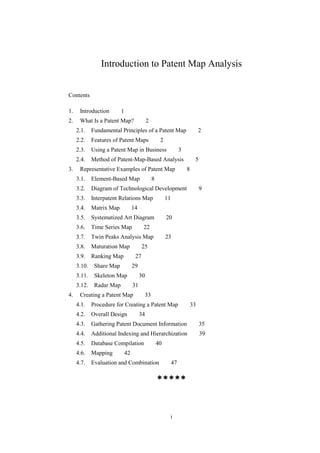 This document provides an introduction to patent map analysis. It defines what a patent map is and discusses the fundamental principles and features of patent maps. Patent maps visually organize and present patent information for a specific purpose, such as identifying technology trends, competitors' strategies, or new areas for research and development. The document outlines various types of patent map analyses and examples of different map formats. It also describes how companies commonly use patent maps across different business divisions and the general process for creating a patent map from gathering patent documents to mapping the information.