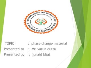 This document discusses phase change materials (PCMs) for energy storage applications. It begins with an introduction to PCMs and their characteristics like high energy storage density and ability to store/release energy at a constant temperature. It then covers classifications of organic and inorganic PCMs and compares their properties. Challenges like low thermal conductivity of organic PCMs are discussed along with solutions like adding thermal conductivity enhancers. The document concludes that PCMs are promising for energy storage due to their high storage density and ability to store/release energy at constant temperatures.