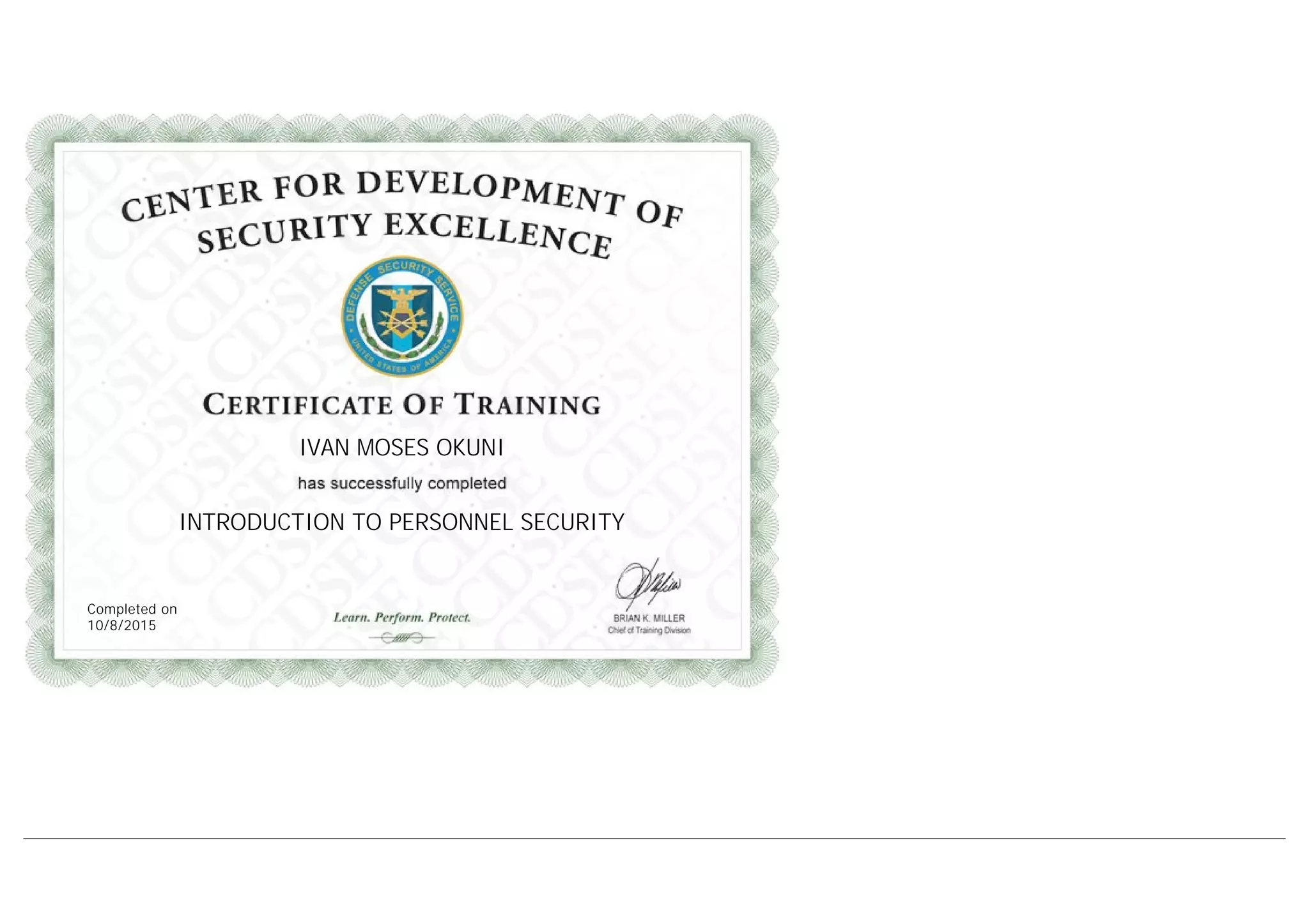 The document provides an introduction to personnel security completed by Ivan Moses Okuni on October 8th, 2015. It discusses the topic of personnel security and provides a basic overview of the subject. The completion date of the document is October 8th, 2015.