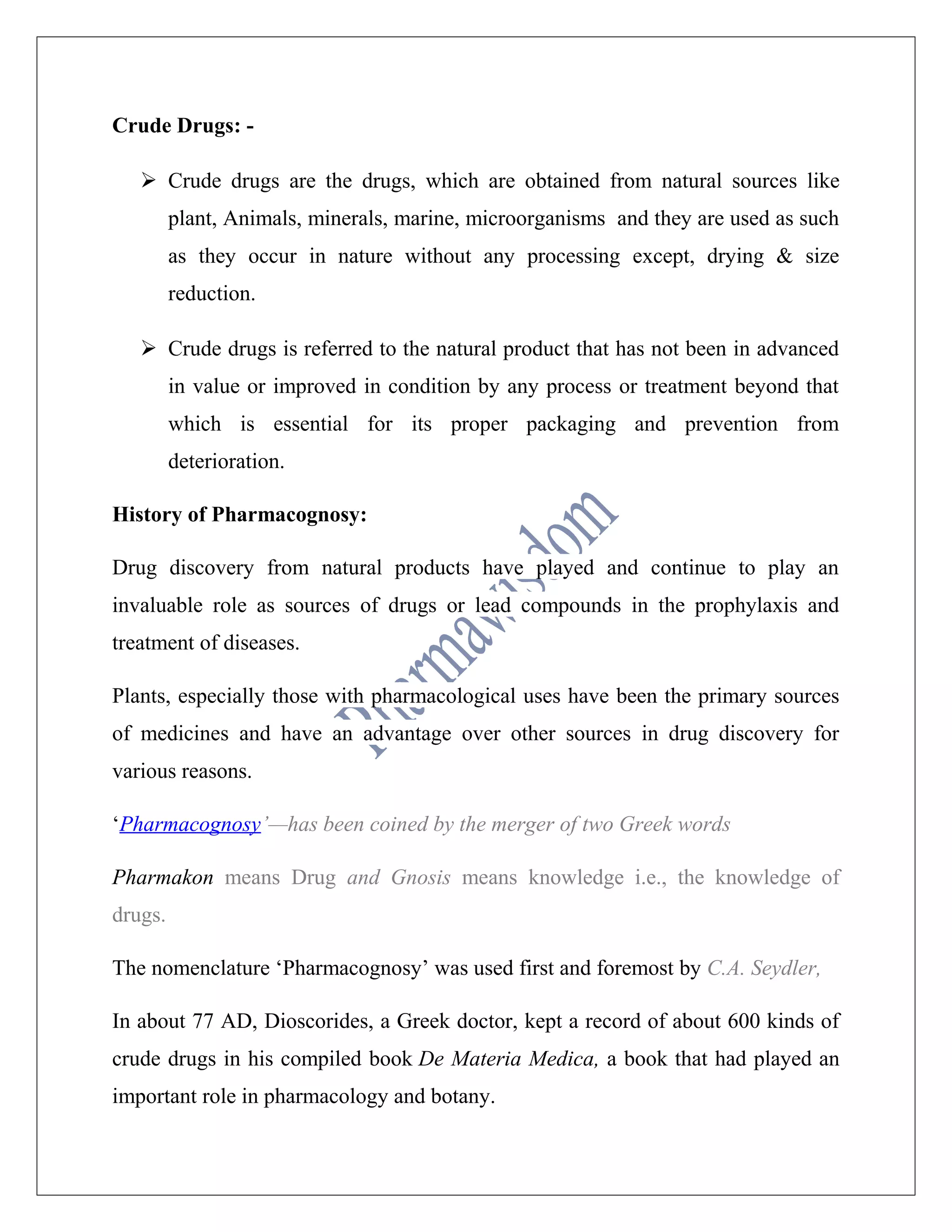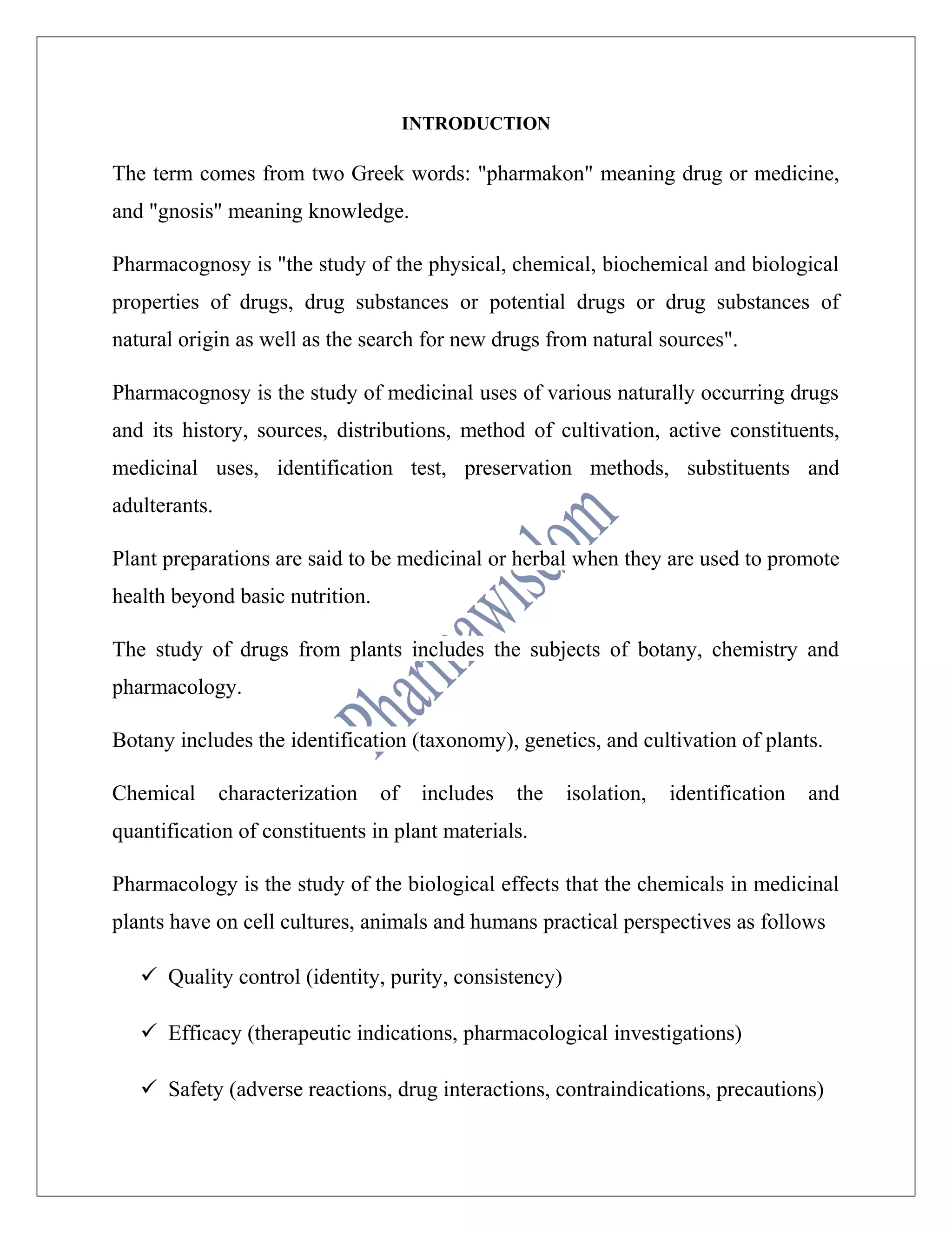 Pharmacognosy is the study of natural drugs, focusing on their properties, sources, and medicinal uses derived from plants and other natural materials. It integrates various disciplines like botany, chemistry, and pharmacology to ensure quality, efficacy, and safety of herbal medicines while also being an essential link between pharmaceuticals and basic sciences. Historically rooted in ancient practices, pharmacognosy continues to play a vital role in drug discovery and healthcare improvement through advanced cultivation and processing techniques.