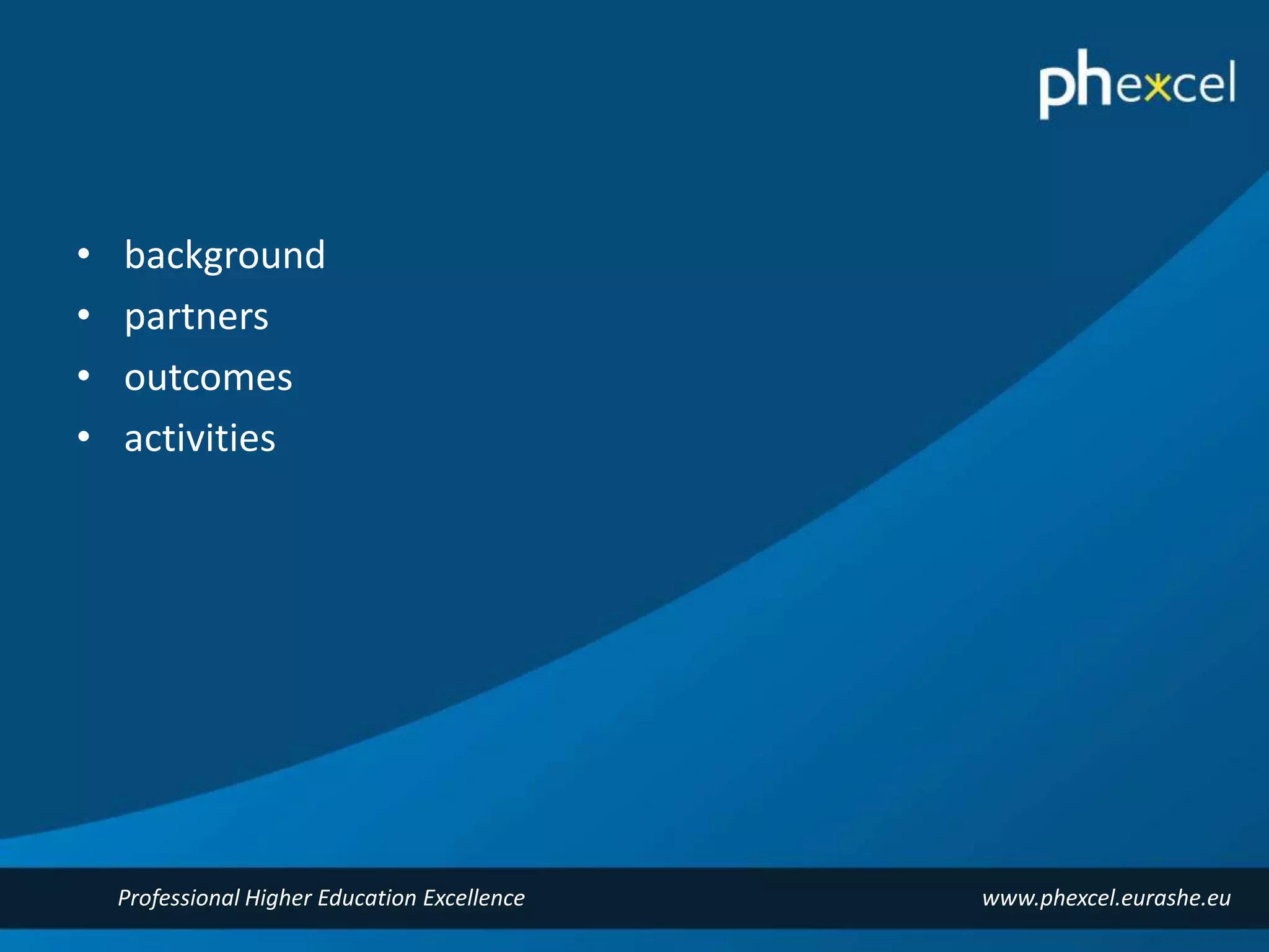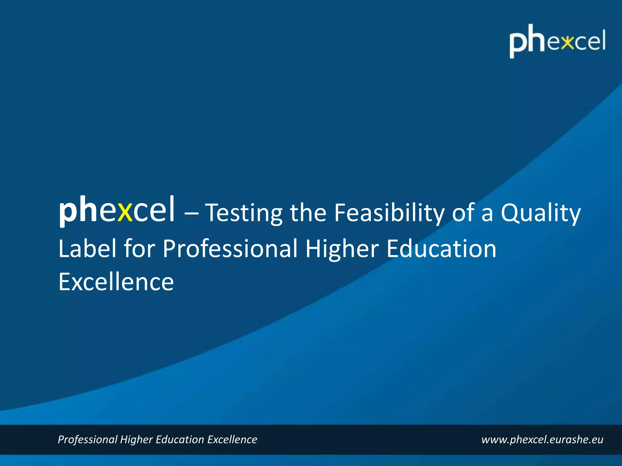 The Phexcel project aimed to test the feasibility of a quality label for professional higher education excellence, involving seven partners and active from October 2013 to December 2015. Key outcomes include a comprehensive report on quality tools, a draft quality framework for PHE excellence, and a feasibility analysis for the quality label. The project also included steps for research, creation, validation, and recommendation of the quality framework, along with stakeholder consultations and pilot evaluations.