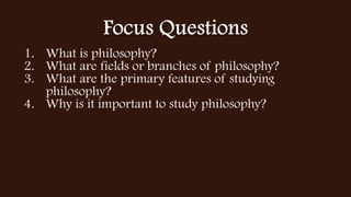 This document discusses philosophy and related concepts. Philosophy is defined as the study of fundamental problems concerning existence, knowledge, values, reason, mind, and language. It seeks to answer big questions about identity, purpose, free will, ethics, and the existence of God and an afterlife. Philosophy comes from the Greek words for "love" and "wisdom" meaning a love of wisdom. The document also discusses skills, intelligence, knowledge, and wisdom, as well as fields of philosophy and the primary features and importance of studying philosophy.