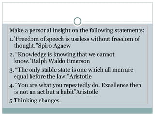 This document provides an introduction to a course on philosophy. It defines philosophy as the love of wisdom and the search for meaning. It outlines the course, which will cover definitions of philosophy, why it is studied, its major fields and issues. It discusses perceptions of philosophy and provides reminders for students. Specifically, it emphasizes developing skills in analysis, criticism and synthesis through careful reading. It also explains how the study of philosophy helps prepare students for theological studies by developing rigorous thinking habits and understanding philosophical foundations of religious doctrines.