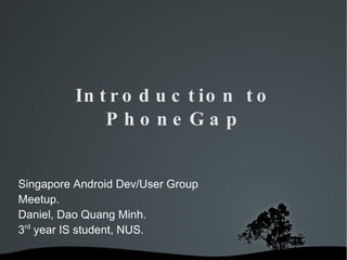 PhoneGap is an open source tool that allows developers to build mobile apps using HTML, CSS, and JavaScript instead of native languages like Objective-C or Java. It wraps the web view container to give apps access to device features like geolocation and accelerometers. While documentation is still maturing and bugs may exist, PhoneGap is free, open source, and offers developers a way to create cross-platform mobile apps without having to learn multiple programming languages. Sample PhoneGap apps and getting started resources are provided.