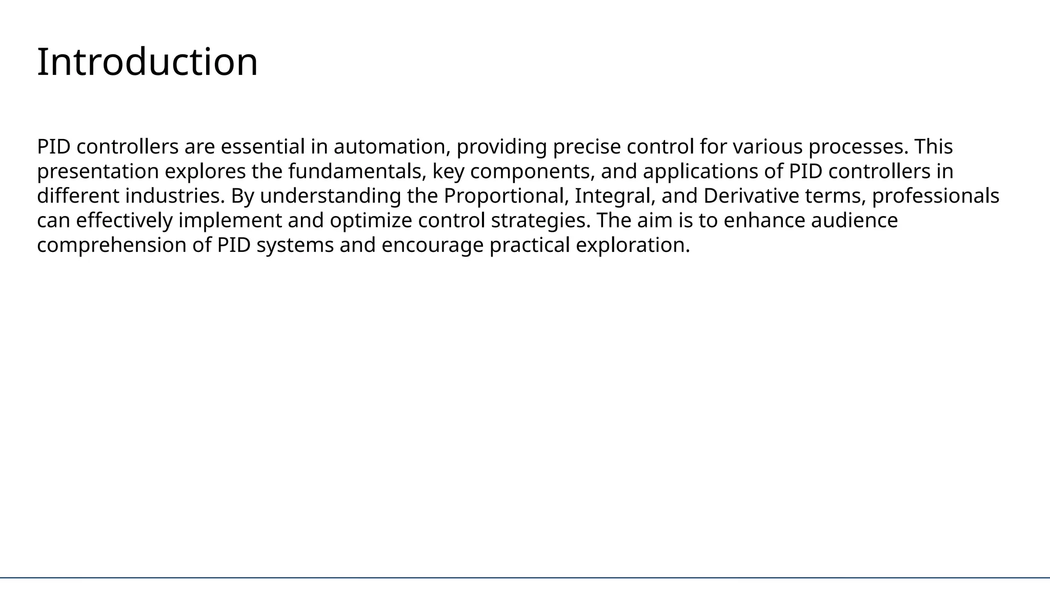 A PID (Proportional-Integral-Derivative) controller is one of the most fundamental and widely used components in control systems. It continuously calculates an error value and applies corrections to bring the system to the desired state. From balancing robots to cruise control in vehicles, PID controllers are everywhere. In this session, we will explore the basic structure of a PID controller, understand the role of each term, and discuss its practical applications in real-world systems. This talk aims to provide a beginner-friendly overview of how PID control works and why it's so effective in both simple and complex automation tasks.