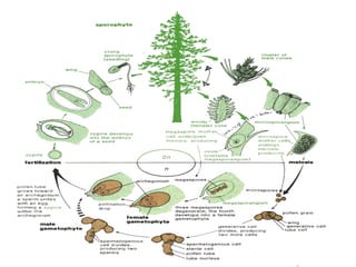 Vascular plants evolved adaptations for survival on land such as obtaining and preserving water. Seed-bearing plants were most successful with adaptations like producing seeds that could be dispersed independently of water. Gymnosperms were the first seed-bearing plants but had exposed seeds, while flowering plants (angiosperms) produced specialized reproductive structures called flowers and fruits to enclose and nurture seeds. Angiosperms diversified greatly and many provided benefits to humans like domesticated grains.