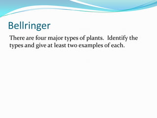 This document summarizes key information about plant structures and classifications. It begins by identifying the four main characteristics shared by all plants: they perform photosynthesis, have a cuticle layer, cell walls, and alternation of generations. It then describes the four major groups of plants as nonvascular plants, vascular plants, seed plants, and flowering plants. The document provides examples and explains the structures, functions, and importance of roots, stems, leaves, and flowers. It also distinguishes between gymnosperms and angiosperms.