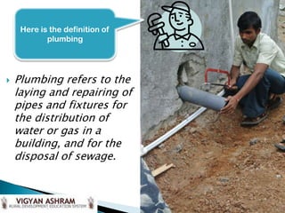 Plumbing refers to installing pipes for water distribution and sewage disposal in buildings. It is important for preventing disease transmission, removing dirty water and human waste, and providing easier access to water. When planning plumbing, key considerations include having a suitable pipe layout, water supply, and ensuring pipes are secured and run parallel to the building. Pipes must follow the gradient and cannot go above it for water to flow properly.