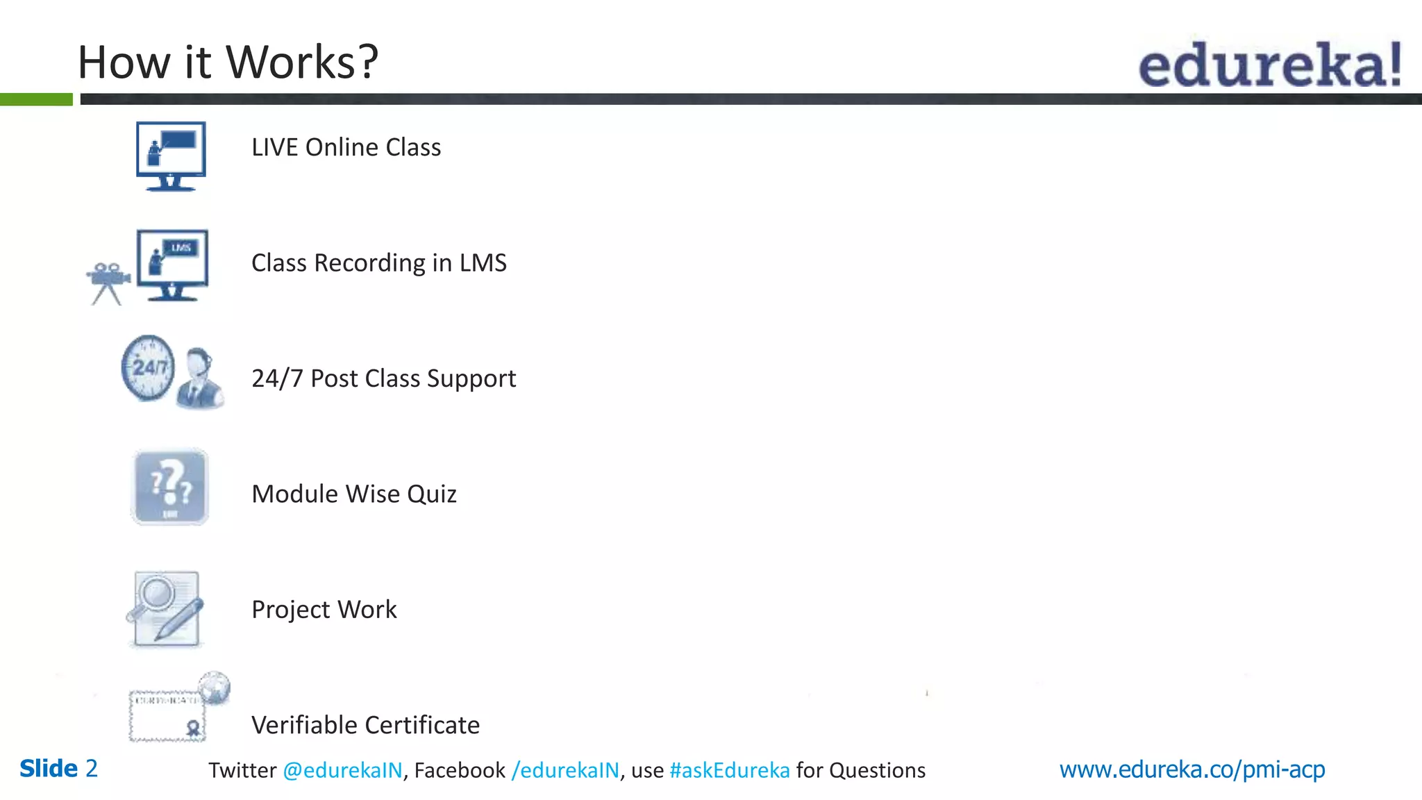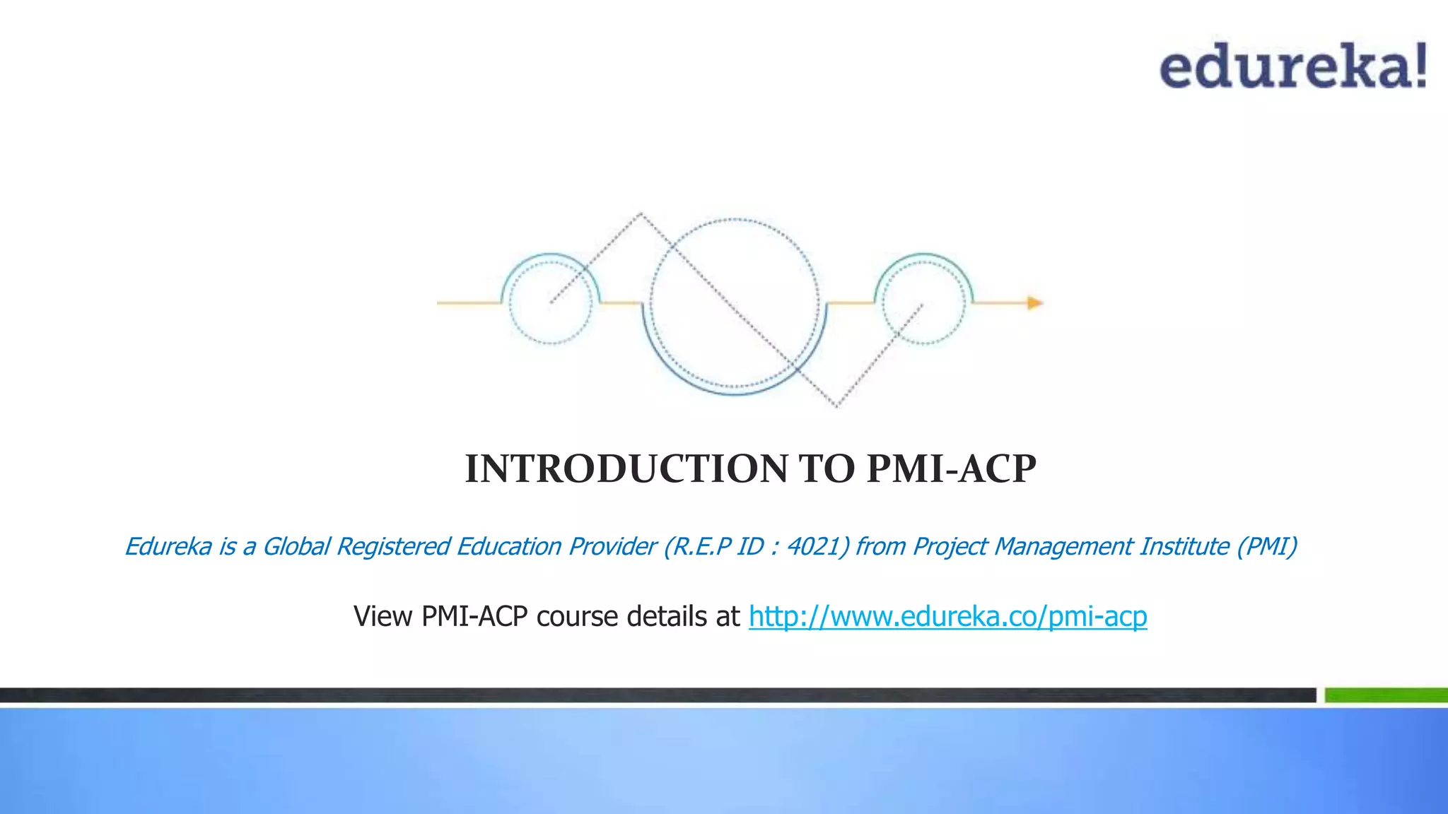 The document provides an introduction to the PMI-ACP certification. It discusses that Edureka is a registered education provider with PMI and offers a PMI-ACP certification course. The objectives of the course are to understand PMI and its credentials, Agile principles, the PMI-ACP exam process, and the differences between PMP and PMI-ACP. It also outlines the eligibility requirements, exam format, and benefits of obtaining the PMI-ACP certification.