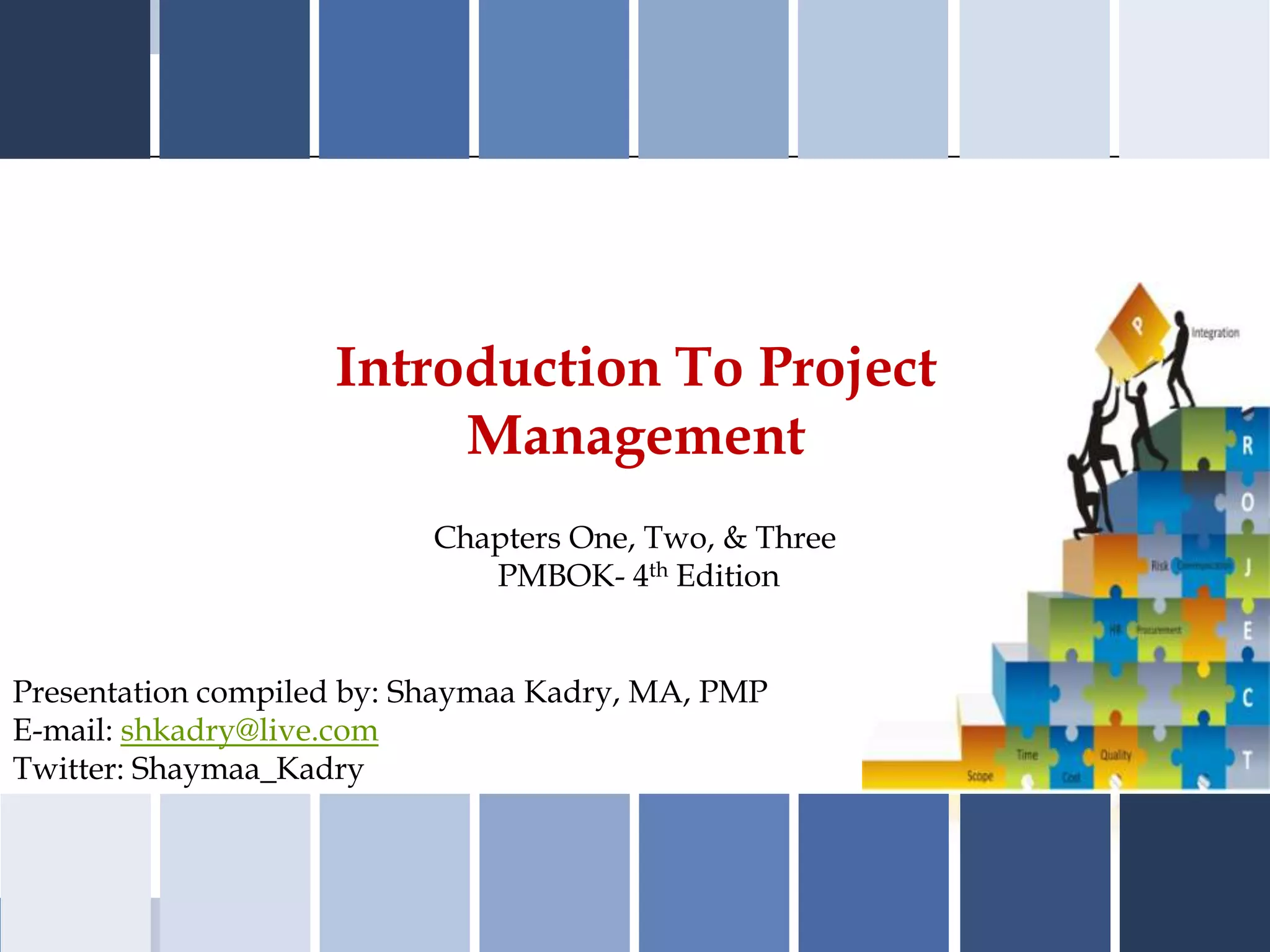 This document provides an overview of project management concepts discussed in chapters one through three of the PMBOK Guide 4th edition, including definitions of projects, project management, and the differences between project, program and portfolio management. It also discusses the project life cycle, organizational influences, and key project roles like the project manager and stakeholders.
