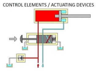This document provides an introduction to pneumatic systems, outlining their basic components, advantages, and disadvantages. Pneumatic systems utilize compressed air for energy transmission and control, with components including compressors, control valves, and execution components like cylinders. The document details the functions of major pneumatic components, their operation, and relevant pneumatic symbols for understanding system design.