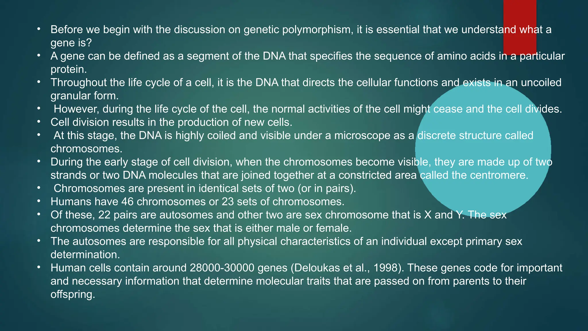 The document discusses genetic polymorphism, defined as the presence of multiple forms of a gene in a population, particularly when variations exceed 1% frequency. It explains the structure and function of chromosomes, mutations, and the various types of polymorphisms such as single nucleotide polymorphisms and insertion-deletion polymorphisms. Key examples include the ABO blood group system and the HLA system, highlighting how genetic variations influence traits and biological functions in humans.