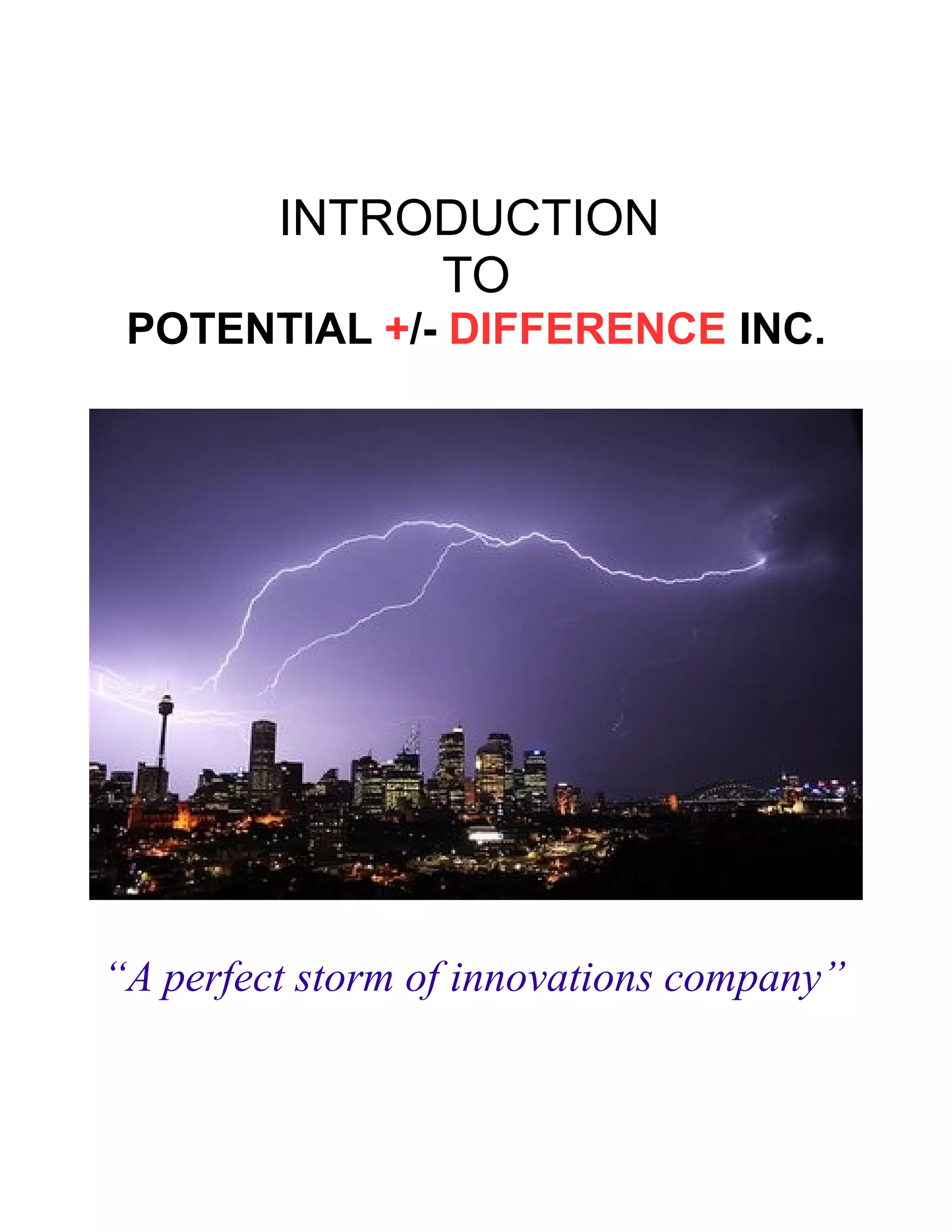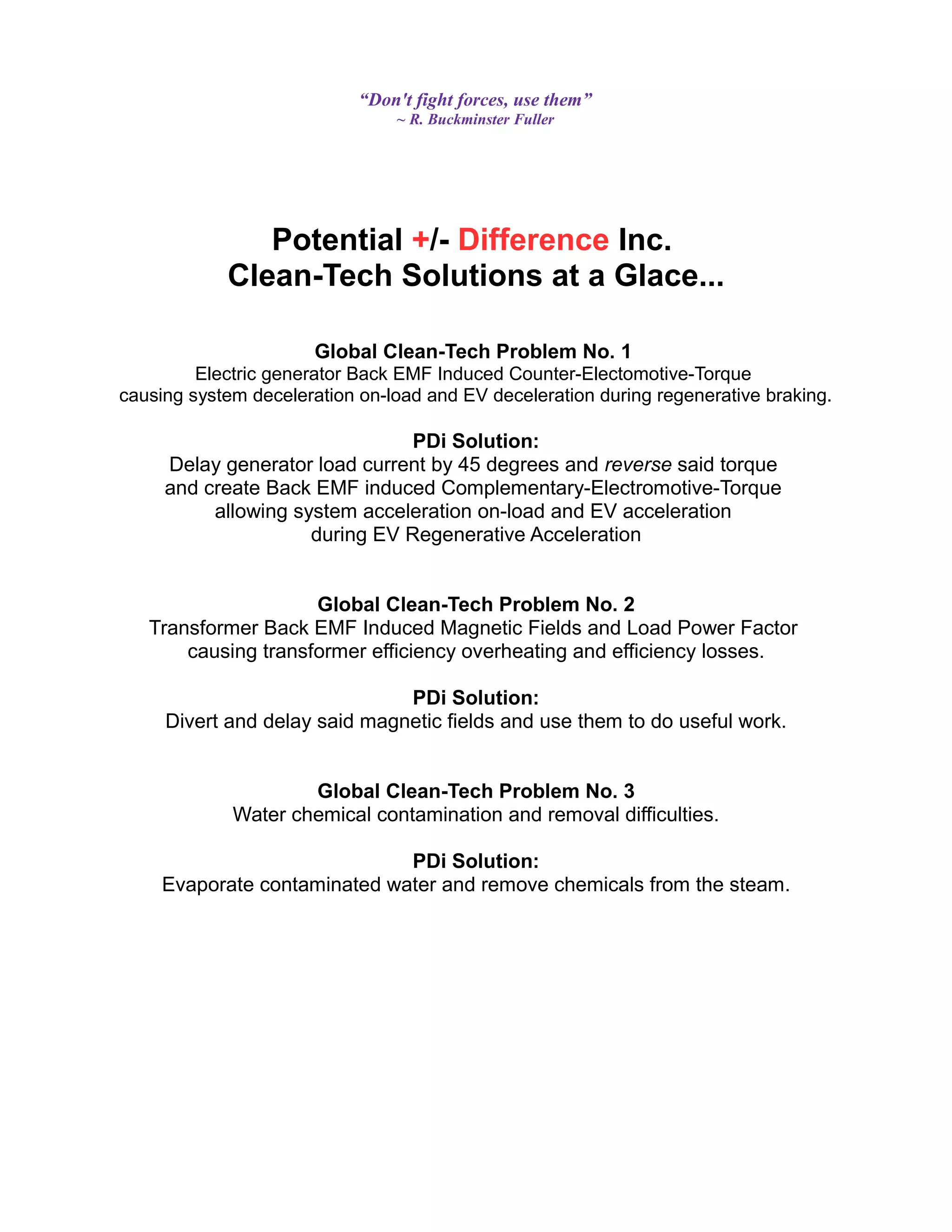 Potential +/- Difference Inc. (PDI) is a Canadian clean-tech company that specializes in electric power generation, consumption reduction, and water purification. They are commercializing three innovations: the regenerative acceleration generator (Regen-X), the bi-toroid transformer (Bitt), and the hydro chemical stripper (H2OP), each addressing significant clean-tech challenges. PDI's technologies aim to enhance efficiency in electric vehicles and transformers while providing effective solutions for water contamination.