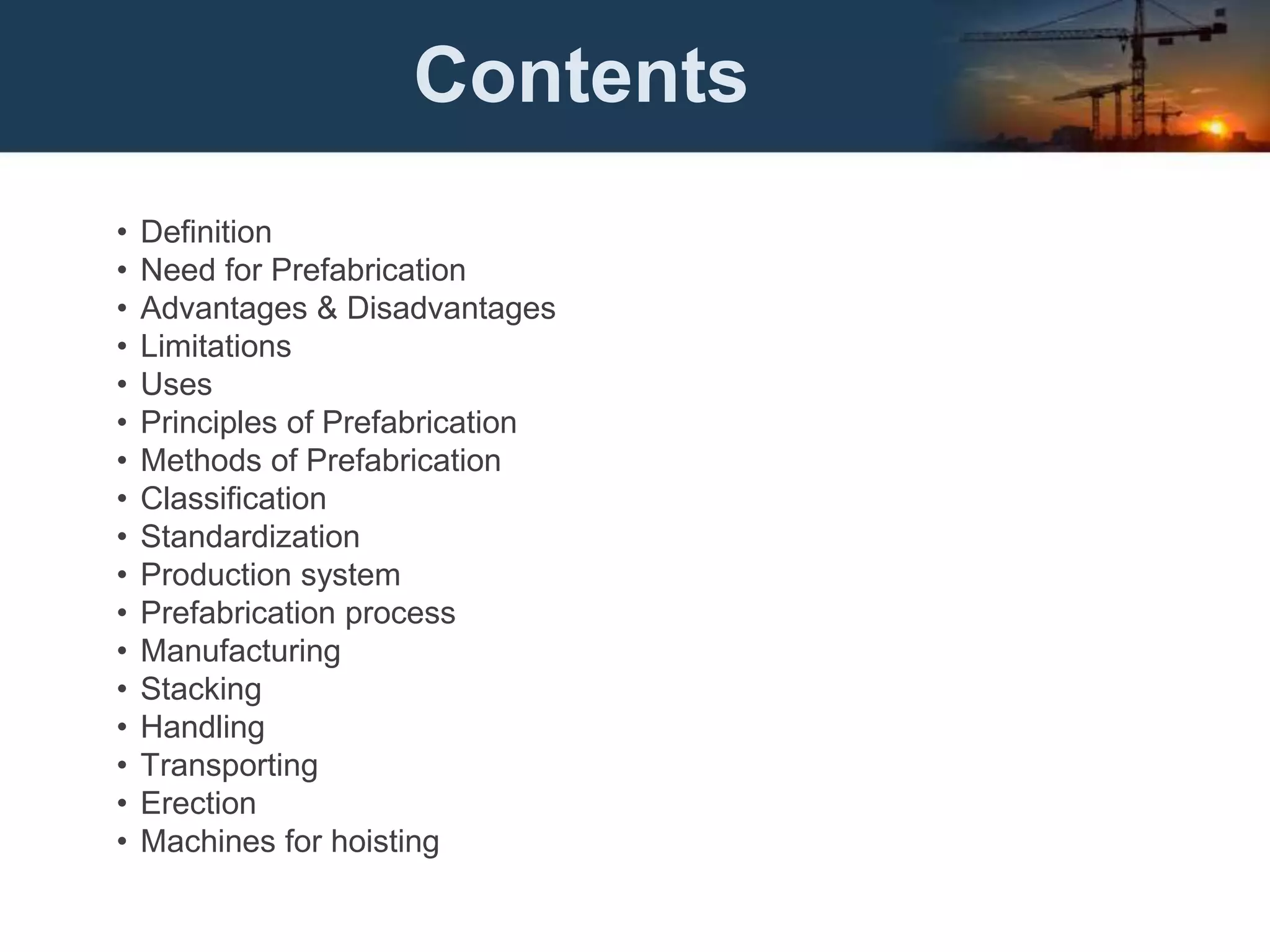 The document discusses prefabricated structures for use in emergency conditions. It defines prefabrication as assembling building components off-site and transporting them to the construction location. Prefabrication offers advantages like faster construction, improved quality control, minimized on-site work during bad weather. The document outlines the need for prefabrication, its advantages and limitations, different uses, principles, methods of prefabrication, production systems, and the prefabrication process from manufacturing to transportation and erection. It also discusses standardization and various machinery used in handling, transporting, and erecting prefabricated components.
