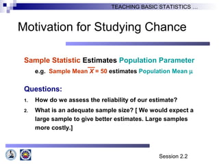 This document provides an overview of teaching basic probability and probability distributions to tertiary level teachers. It introduces key concepts such as random experiments, sample spaces, events, assigning probabilities, conditional probability, independent events, and random variables. Examples are provided for each concept to illustrate the definitions and computations. The goal is to explain the necessary probability foundations for teachers to understand sampling distributions and assessing the reliability of statistical estimates from samples.