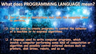 The document outlines the role of a programmer, detailing their responsibilities in designing, writing, testing, debugging, and maintaining source code using various programming languages. It emphasizes the importance of converting problem solutions into computer-understandable instructions and refers to natural languages that resemble English for better communication with users. Additionally, it highlights the evolution of programming languages, including assembly and fifth-generation languages.