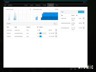 Project Atomic is a framework designed to create an optimized operating system for running containers, built from RHEL, CentOS, and Fedora, aiming for easier management and enhanced security. Key components include rpm-ostree for system updates, Docker for container management, and Kubernetes for orchestrating containerized applications. The project also involves special interest groups (SIGs) for developing specialized CentOS variants to enhance software capabilities while maintaining stability.
