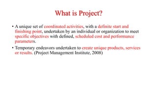 This document provides an overview of project management. It defines a project as a temporary set of activities undertaken to achieve unique objectives within defined cost and time parameters. Key aspects of projects include their unique purpose, temporary nature, use of various resources, and involvement of uncertainty. The document distinguishes projects from operations and programs/portfolios. It also outlines the triple constraints of quality, cost, and time that define projects. Additionally, it describes different types of project products and components of project management based on the Project Management Body of Knowledge (PMBOK).