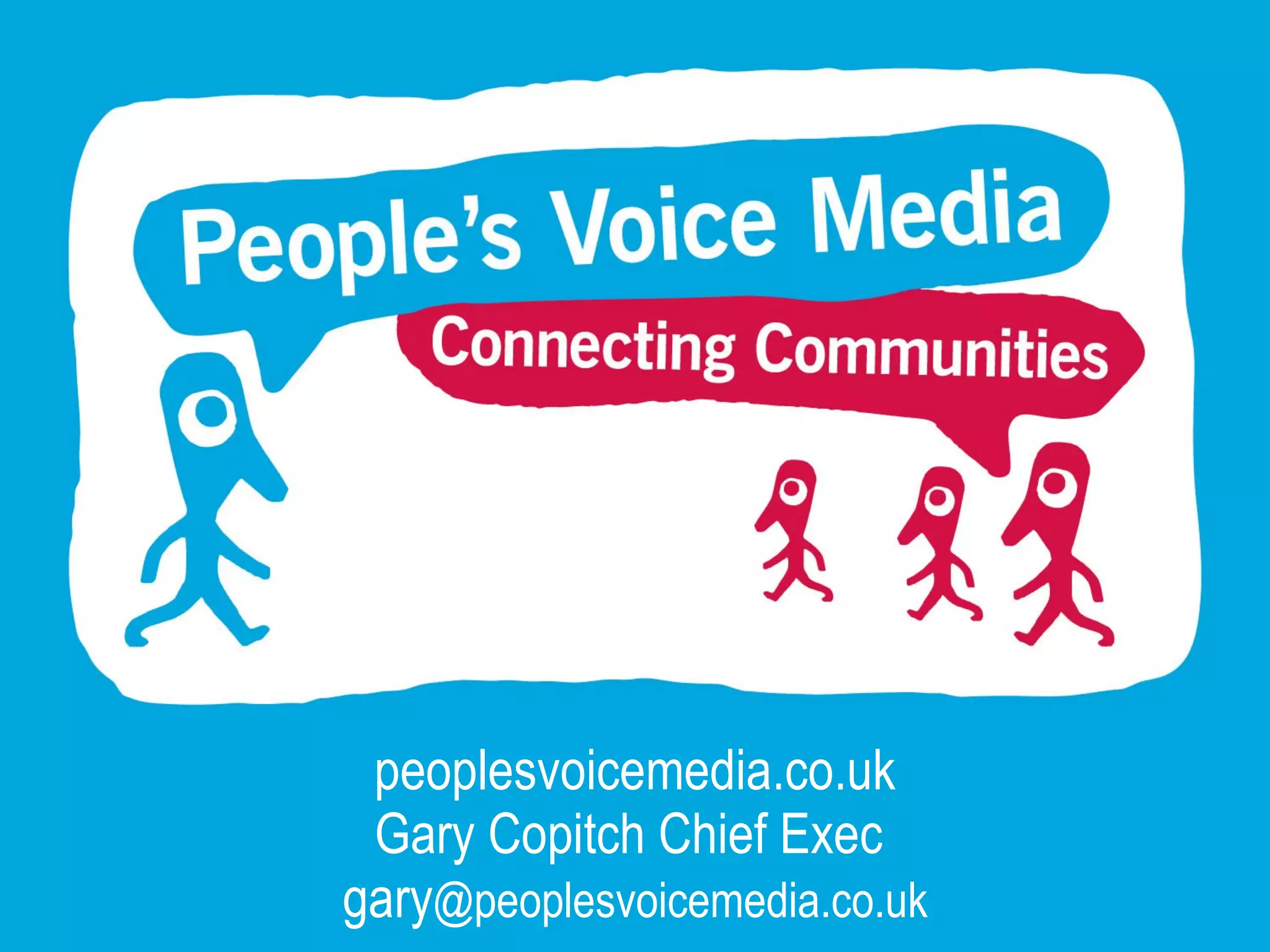 Peoplesvoicemedia is a nonprofit organization that connects communities through digital tools to empower civic participation and governance. It gives communities a voice by developing dialogues through social media and storytelling. It operates social media centers that provide training and community networking resources. The organization seeks partners to expand its community reporting programs and social media center network to more communities.